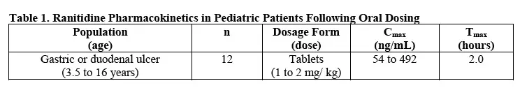 Pediatrics: There are no significant differences in the pharmacokinetic parameter values for ranitidine in pediatric patients (from one month up to 16 yrs of age) and healthy adults when correction is made for body weight. The average bioavailability of Ranitidine is given orally to pediatric patients is 48%, which is comparable to the bioavailability of Ranitidine in the adult population. All other pharmacokinetic parameter values (t1/2, Vd, and CL) are similar to those observed with intravenous Ranitidine use in pediatric patients. Estimates of Cmax and Tmax are displayed in Table 1.