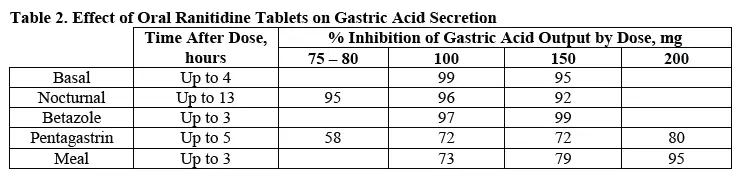 1. Effects on Acid Secretion: Ranitidine Tablets inhibits both daytime and nocturnal basal gastric acid secretions as well as gastric acid secretion stimulated by food, betazole, and pentagastrin, as shown in below Table 2.