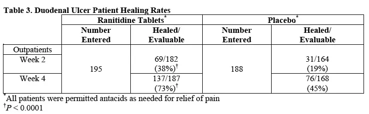 Clinical Trials: Active Duodenal Ulcer: In a multicenter, double-blind, controlled, US study of endoscopically diagnosed duodenal ulcers, earlier healing was seen in the patients treated with Ranitidine Tablets as shown in Table 3.