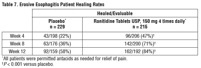 Erosive Esophagitis:In 2 multicenter, double-blind, randomized, placebo-controlled, 12- week trials performed in the United States, Ranitidine Tablets USP, 150 mg 4 times daily was significantly more effective than placebo in healing endoscopically diagnosed erosive esophagitis and in relieving associated heartburn. The erosive esophagitis healing rates were as follows in Table 7: